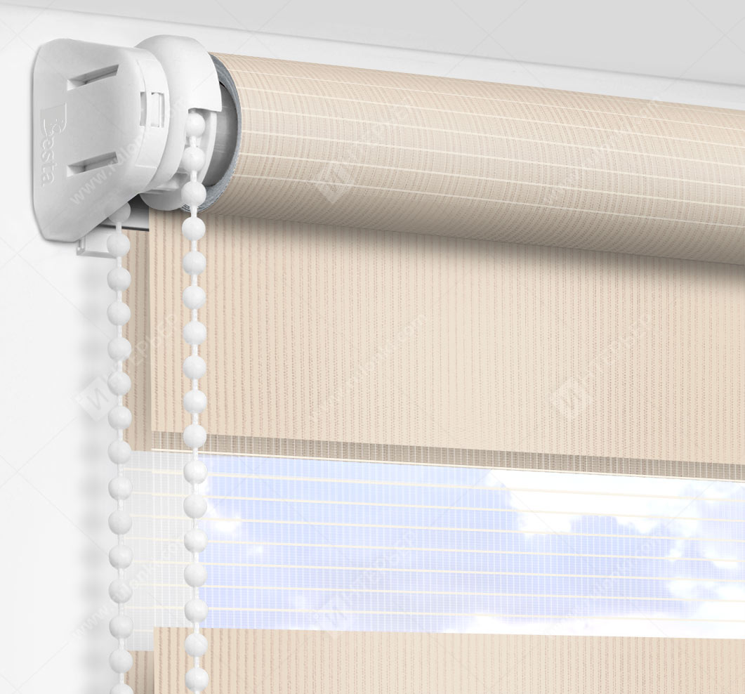Рулонные шторы Зебра работают следующим образом: полоски ткани смещаются так, чтобы совпали светлые или темные слои, образуя, плотное или более прозрачное полотно. Так обеспечивается ночной или дневной режим затемнения. Также можно поднять шторное полотно полностью, открывая окно. По умолчанию - цвет фурнитуры белый.