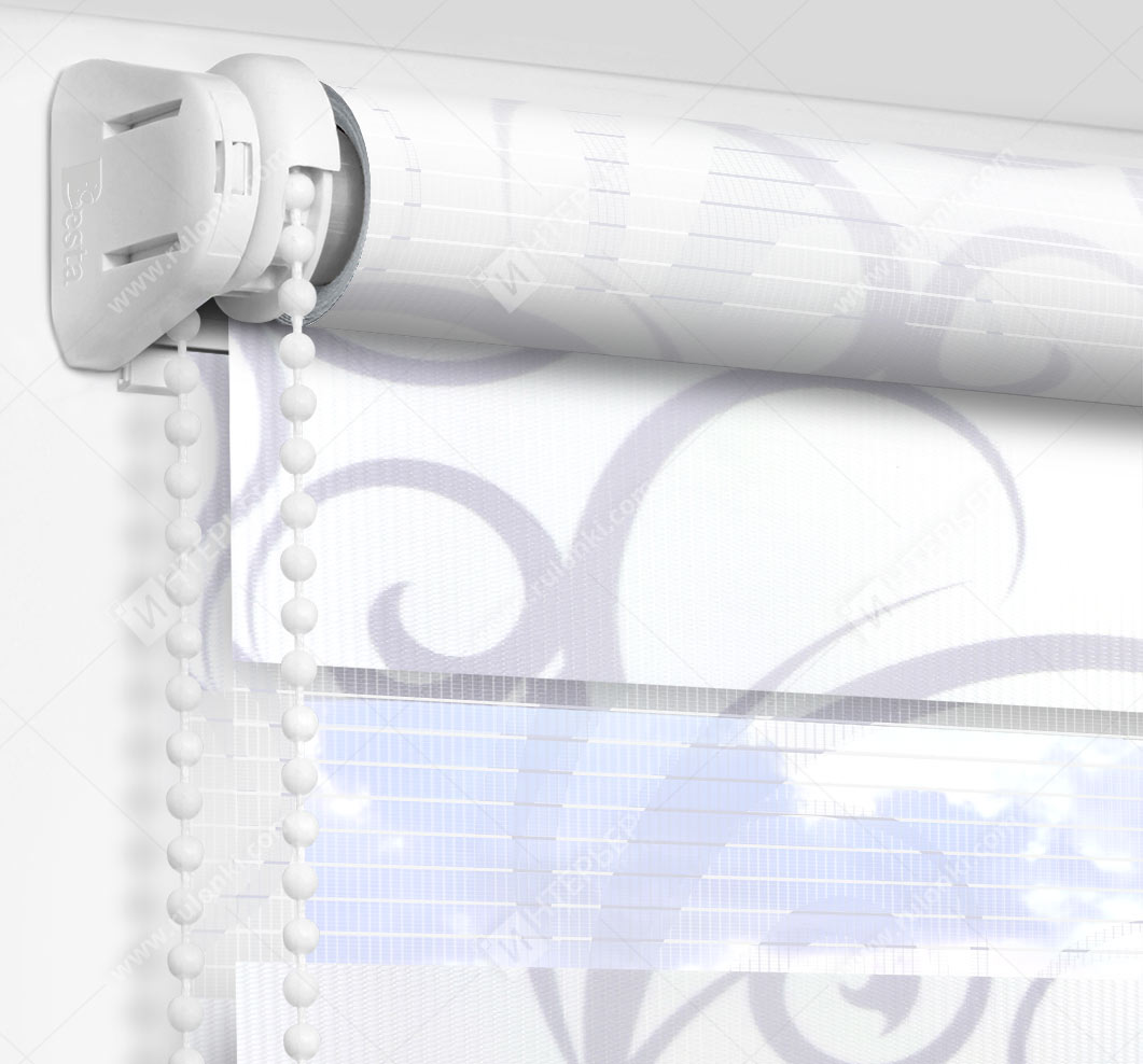 Рулонные шторы Зебра работают следующим образом: полоски ткани смещаются так, чтобы совпали светлые или темные слои, образуя, плотное или более прозрачное полотно. Так обеспечивается ночной или дневной режим затемнения. Также можно поднять шторное полотно полностью, открывая окно. По умолчанию - цвет фурнитуры белый.